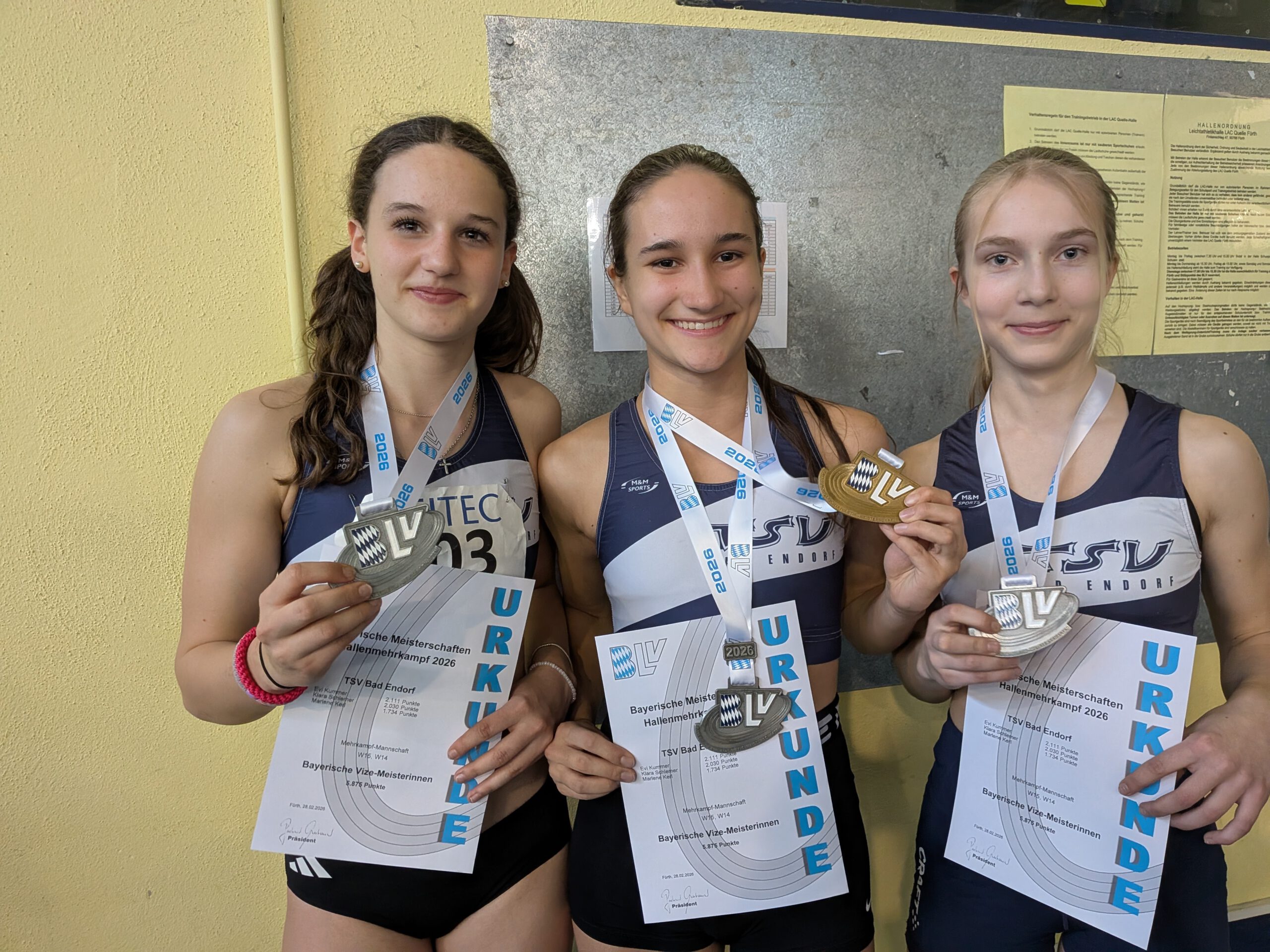 Ein ganz junges Team aus Bad Endorf ging im Siebenkampf der weiblichen Jugend U16 an den Start. Am Ende belegte die Mannschaft mit Ronja Fürst, Amelie Gratz und Ellena Larson die Bronzemedaille. Als zweitbeste Oberbayerinnen sammelten sie 9574 Punkte und unterlagen damit nur der favorisierten LG Sempt mit 10086 Punkten und dem SWC Regensburg (10003 Punkte). In der Siebenkampf-Einzelwertung der Jugend W15 war Ronja Fürst die erfolgreichste Endorferin: Mit 3517 Punkten wurde sie Vierte und schrammte nur um acht Punkte an der Bronzemedaille vorbei. Mit 13,06 Sekunden im 100-Meter-Lauf und 12,55 Sekunden über 80 Meter Hürden war sie sogar die zweitbeste Athletin des Tages, sowie im Weitsprung Dritte mit 5,08 Metern. Mit 8,21 Metern im Kugelstoßen, 1,49 Metern im Hochsprung, 26,68 Metern im Speerwurf und 2:35,93 Minuten auf der 800-Meter-Strecke lieferte sie als zweitbeste Oberbayerin konstant gute Resultate. Gold ging an die amtierende deutsche Meisterin Sofie Gröninger von der LG Sempt mit 3800 Punkten.
